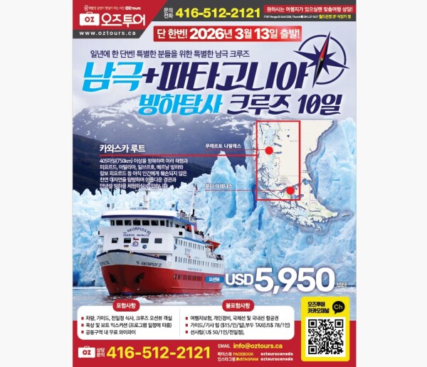 "버킷리스트 남극 탐험"…파타고니아·칠레 명소 결합2026년 3월 단 한 차례 출발, 11월 10일 모집 마감토론토의 한인여행사 오즈투어(OZ Tours)가 캐나다 여행업계 최초로 남극 여행상품을 론칭한다고 밝혔다.이번
