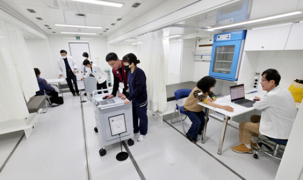 지난달 29일 충북 영동군 상촌면 복지회관 앞에 설치한 이동형 병원에서 마을 주민들이 진료를 받고 있다. 김성태 객원기자"꼭 병원 같네" 대형 트레일러 붙인 이동형 병원지난달 29일 충북 영동군 황간면 상촌면 복지회관. 12m 길이의 대형 트레일러 3