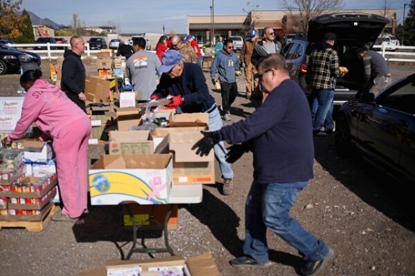 7일(현지시간) 미국 콜로라도주 콜로라도스프링스의 마운트카멜 재향군인복지센터 식품 배급소에서 자원봉사자들이 식료품 상자를 차량에 실을 준비를 하고 있다. 연방정부 셧다운이 수주째 이어지는 가운데 이날 100대가 넘는 차량이 배급소를 찾았다. 로이터=연합뉴스미국 연방정부